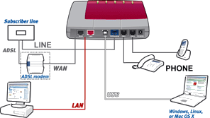 - LAN: port for your (home) network, you can connect e.g. your PC, lap-top, network-printer or wireless router